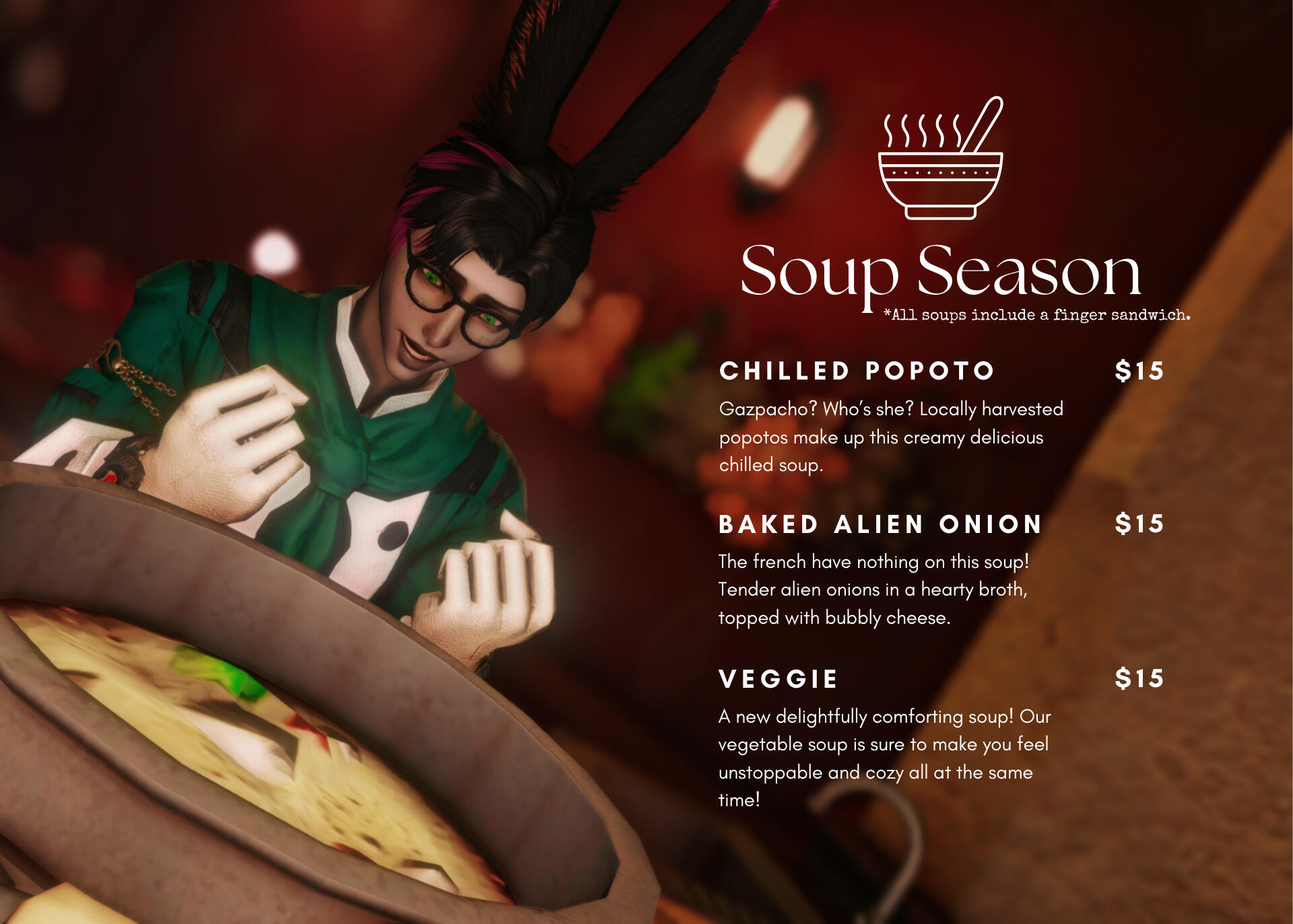 Hello! My name is Lucian Evahn and I am the sole owner here at the Bun N Bean Bistro! Thank you so much for stopping in and checking out the place! I appreciate the support!I have been in Eorzea for about 10 years or so. Originally just as a room renter at the Tonberry Knight Free Company house. It wasn’t until recently, during Eorzea’s housing expansion efforts, was I lucky enough to acquire this building. I’ve been running this as a cafe/bistro since October 2023. I’m on the lookout for a bigger space to expand my services and probably staff.I enjoy glams, designing homes, GPOSE, and making new friends through providing a pleasant experience during all my interactions.Thanks again for taking the time! See you at the bistro!